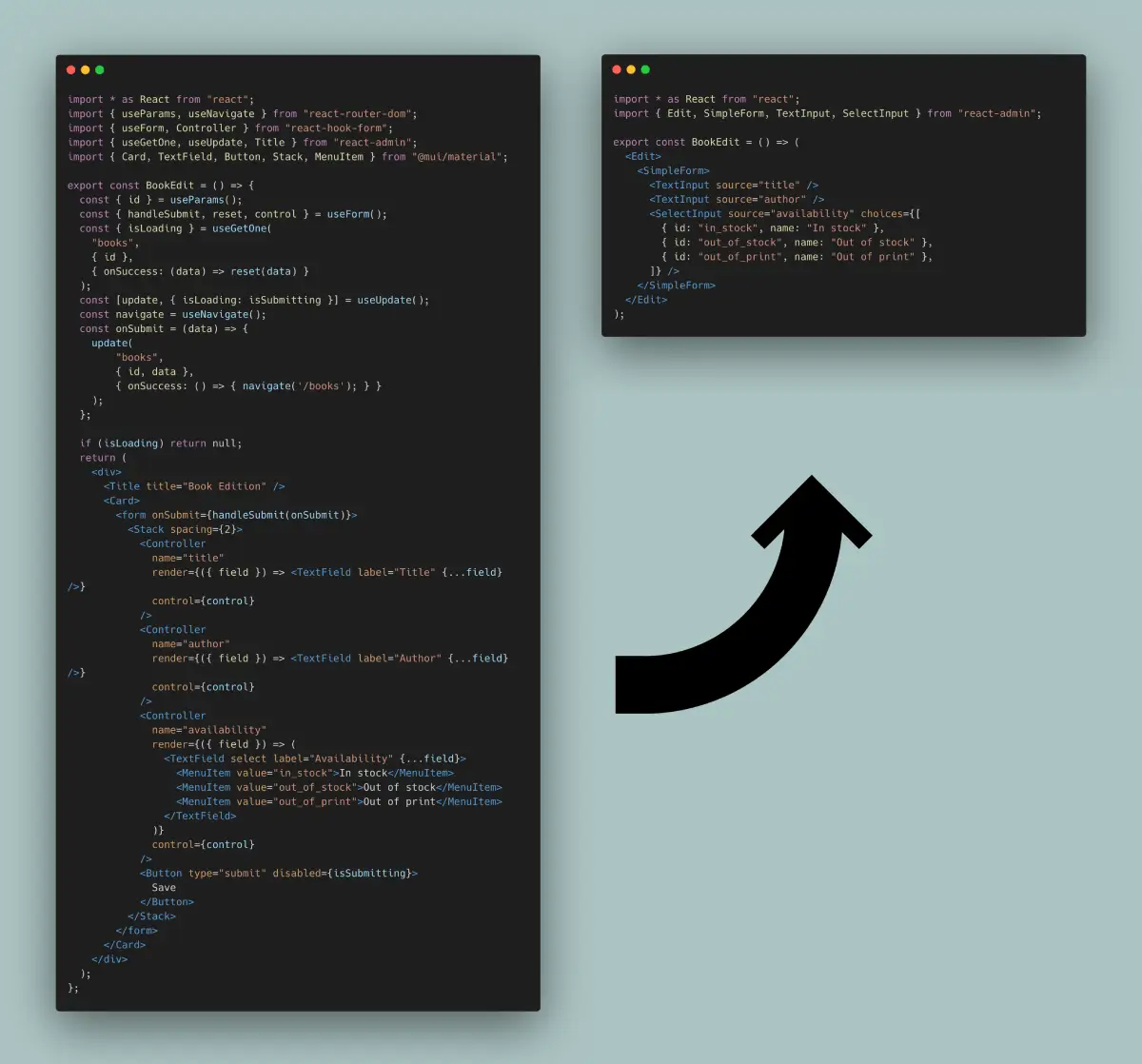 The react example had almost 60 lines of code, the react-admin one only has a quarter of that: